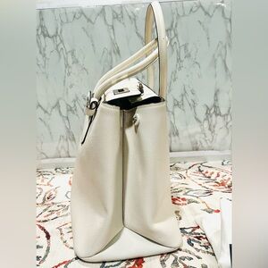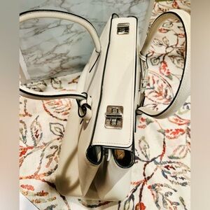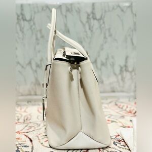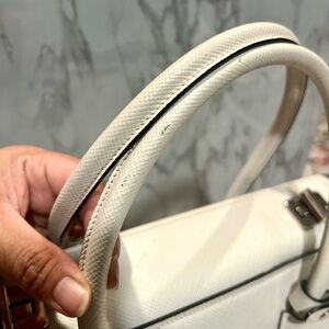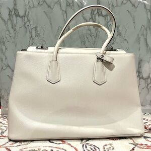 Chic Prada satchel in luxurious cream leather. Features elegant design and iconic logo. Will come with Authenticity Card and dust bag. Greta condition with minor marks. Inside is also clean. Measures 15x10x7”