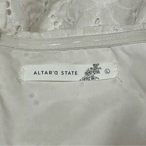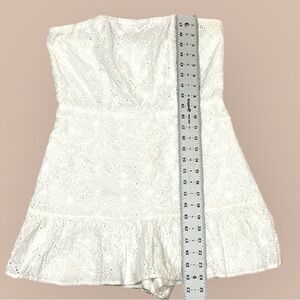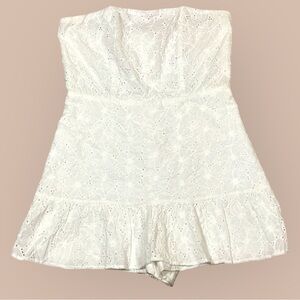 NWOT Altar'd state Baylyn Eyelet Romper in white. Beautiful strapless romper features an eyelet double layered lining with a corset style top with boning for structure. Size L