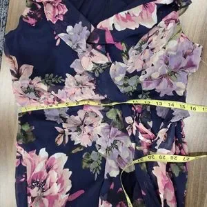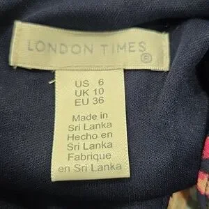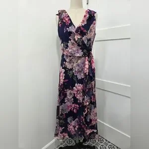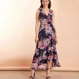 London Times Women's Ruffled Chiffon Flowy Floral Faux Wrap High Low Hem Maxi Dress size 6
