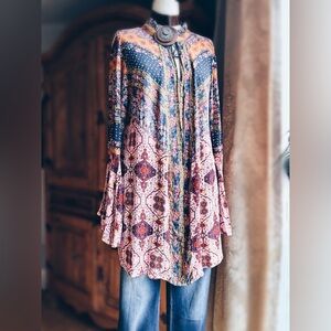 Blouse Colorful paisley and bohemian pattern throughout. Long bell flare sleeves, pullover style, V-neck , tunic/mini dress length. Relaxed fit. Msrp : 55.00 NWOT size M pit to pit 21” Shoulder to hem 34”L