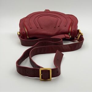 Iconic Chloé Marcie crossbody bag crafted in rich red / burgundy pebbled leather, featuring the signature curved stitching and antiqued gold-tone hardware. A timeless silhouette with effortless Parisian appeal.