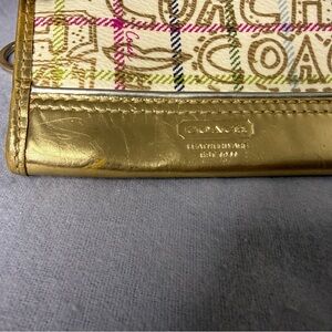 Chic Coach wallet with a plaid pattern and gold trim. Ideal for a stylish touch.