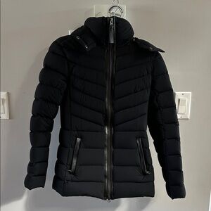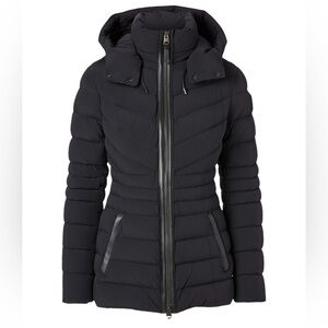 82% Nylon, 18% Spandex; Lining: 82% Nylon, 18% Spandex; Fill: 90% Goose Down, 10% Feathers; Trim: Genuine Leather