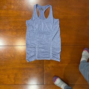 Athleta tank tops in blue and heathered gray. Ideal for workouts or casual outings. Racerback design for comfort.