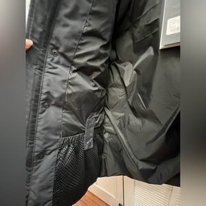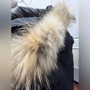Sleek black puffer with fur-trimmed hood. Ideal for winter warmth. Stylish and functional design. Size Small