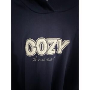 Stylish and comfortable, this Lane Bryant hoodie is perfect for cozy days. Featuring a rich navy blue color, this pullover hoodie showcases an embroidered "Cozy Season" design on the front. The hoodie includes a comfortable hood and a relaxed fit with slightly flared cuff details. A casual and versatile addition to any wardrobe.