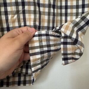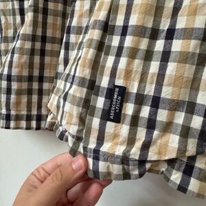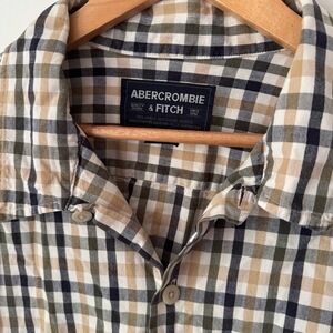 Abercrombie & Fitch oversized-fit short sleeve button-up in brown, tan, black, and white plaid. Lightweight cotton with chest pocket, button-down collar, and small logo tag at hem. Dates to mid-2000s to early 2010s. Perfect for skater, casual Y2K, or mall preppy looks.