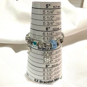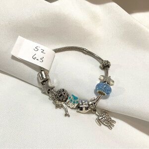 This listing is for a Silver Tone Sea Life Charm Bracelet on a metal cord. It measures a size 6.5 and is in good condition.