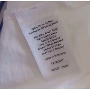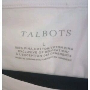 The Talbots Top is a stylish blouse made from 100% pima cotton, perfect for a coastal or nautical theme. The top features a striped pattern, a tie waist closure, and a size large. The crisp white color adds a clean and classic touch to the design, making it a versatile piece for any woman's wardrobe. Ideal for those who appreciate high-quality materials and timeless nautical style.