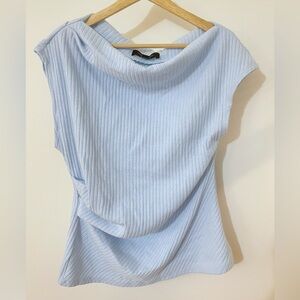 Chic, elegant, and effortlessly flattering—this Marc New York ribbed cowl-neck top is the kind of piece that elevates a simple jeans outfit instantly. Designed in a soft powder blue ribbed knit, it features a draped neckline and cap sleeves that create a smooth, feminine silhouette.