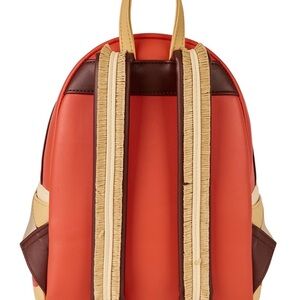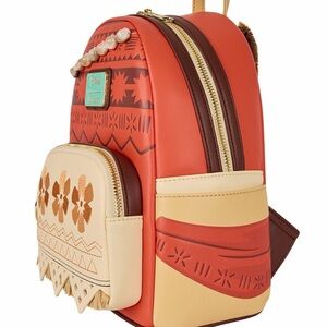 Stylish Loungefly Moana backpack with red and tan floral design. Ideal for daily adventures.