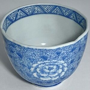 This vintage or possibly antique Japanese teacup has 12 sides and a beautiful transferware pattern with chrysanthemums. It measures 3 inches wide by 2.25 inches tall and is in excellent condition except for a small rim chip (see photo).