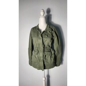 Keywords: utility jacket, military jacket, anorak, olive green jacket, drawstring waist, lightweight jacket, casual jacket, womens jacket, fall jacket, spring jacket, outdoor jacket, pockets, layering piece
