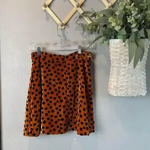 Madewell Women's Brown/Orange/Black Polka Dot Mini Skirt-Side Zip Closure-High Rise Retro-Inspired, Modern Skirt. Ideal for fall and winter styling and vintage inspired outfits. Cottagcore or Indie Casual Wardrobe staple.