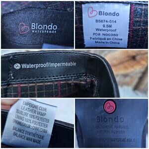 Black nubuck leather upper, cute seam details, cozy flannel plaid lining. Ankle boot height, side zip, almond toe, chunky heel, waterproof construction. Issues noted in photos. Excellent preowned condition, overall. Size 9.5M by Blondo. Style: Nelli.