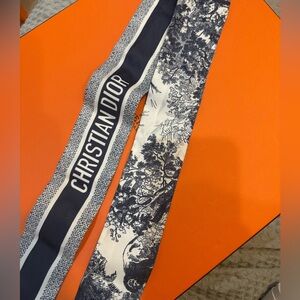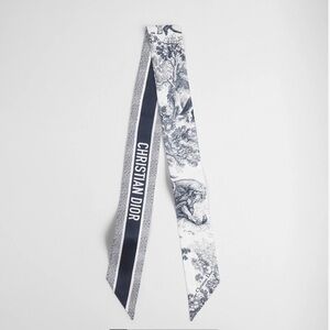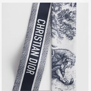 The Toile de Jouy Sauvage Mitzah scarf offers a new take on the hallmark House motif. The timeless ivory and navy blue silk twill style has an elongated shape with pointed ends and is enhanced by a contrasting Christian Dior signature jacquard band on the back. The Mitzah scarf will lend the finishing touch to any modern look and may be worn around the neck, tied at the wrist or on a bag.
