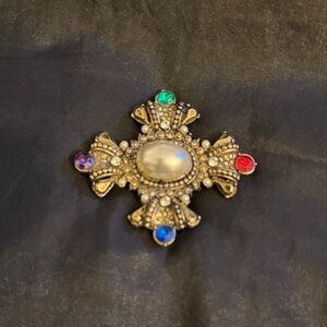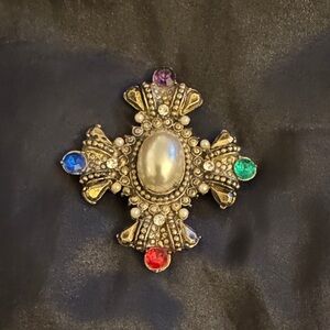 Elegant vintage-inspired brooch featuring a bold cross design with a luminous faux pearl center and sparkling red, blue, green, and purple rhinestones. Antique gold detailing gives it an ornate, royal look — perfect for accessorizing coats, scarves, hats, or evening wear.