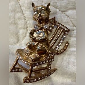 1928 Gold Tone Cat Brooch on Rocking Chair w/ Rhinestones