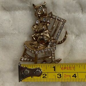 1928 Gold Tone Cat Brooch on Rocking Chair w/ Rhinestone. Perfect for adding a whimsical touch to any outfit. Excellent condition see pictures for more details and measurements.