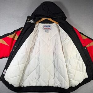 Embrace game day spirit with this iconic San Francisco 49ers Anorak jacket. Bold red and black color blocking with striking gold accents creates a dynamic look, while the embroidered team logo proudly showcases your allegiance. The comfortable quilted lining and attached hood offer warmth and protection, making it perfect for cheering from the stands or casual wear. Ideal for tailgating, watching the game at a sports bar, or everyday fan wear.