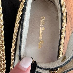 Gently worn on a few special occasions. Excellent preowned condition. Originally bought new from Neiman Marcus. These dress shoes feature a sophisticated black and gold color scheme, perfect for formal occasions. Crafted with luxuriously soft black suede leather, these timelessly stylish shoes are adorned with golden braid details and front bows for an elegant finishing touch. The ultimate wardrobe staple designed by Petite Maison Kids. Hand-crafted in Portugal using only the best quality leathers. Naturally comfortable and distinctively different.