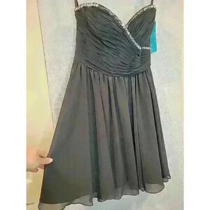 Two Rhinestones on the back have come loose. They are still attached but need tightened. Otherwise new with tags, size 12 mini formal dress with rhinestone sweetheart strapless neckline.