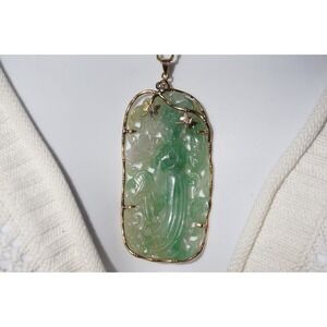 This is a stunning gold natural Jadeite Jade diamond pendant. The pendant is made out of tested 14k solid gold. It weighs 28.32 Grams. The pendant features one jadeite stone and three bright diamonds. The jadeite stone measures approximately 3" tall and 1 1/2" across. the diamonds measure 1mm. It's in excellent antique condition. If you have any questions I'm more than happy to answer them. Thanks for stopping by!
