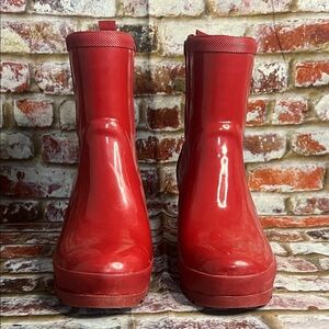 Bold red boots for rainy days. Waterproof and stylish. Perfect for wet weather.