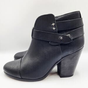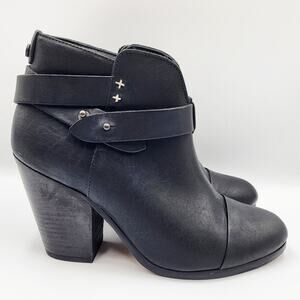 Rag & Bone Harrow Black Leather Push Pin Strappy Buckle Accents Moto Ankle Boots Stacked Block Heel