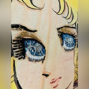 Those huge mesmerizing blue eyes — lavishly hand-embellished with multi-layered sequins, colorful beads, metallic threads, and sparkling crystal details. Super 3D, incredibly intricate, and catches light like crazy. In person the eye work is even more stunning than photos — true collector-level craftsmanship!