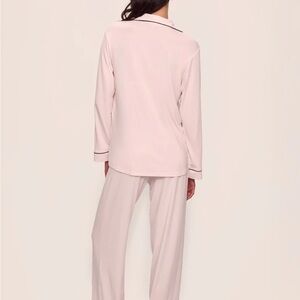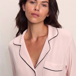 Soft blush pajama set with elegant black trim. Button-up top and relaxed pants. Perfect for a cozy night.