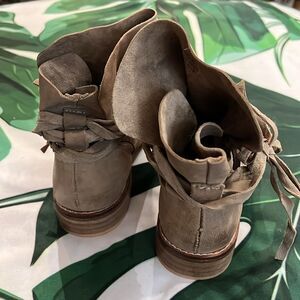 Free people, soft tan leather ankle boots with multi string tie around the ankle. Excellent used condition no damage. These are European size 37 with a low heel height of half an inch.