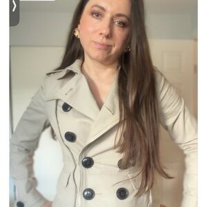 Classic Burberry Brit trench coat in beige. Features double-breasted design and signature check lining. Perfect for a sophisticated look.