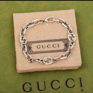 This elegant Gucci bracelet features the iconic interlocking G motifs, crafted in polished silver. The chunky chain design adds a bold touch, while the interlocking G pendants showcase the brand's timeless appeal. Perfect for adding a luxurious edge to any outfit, this bracelet is a versatile accessory for both everyday wear and special occasions.