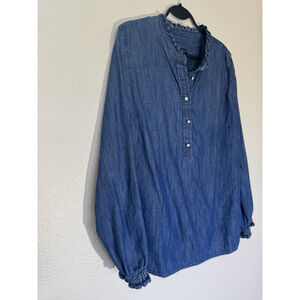 Talbots Women’s Large Denim Chambray Top Ruffle Neck Henley Blouse Long Sleeve
