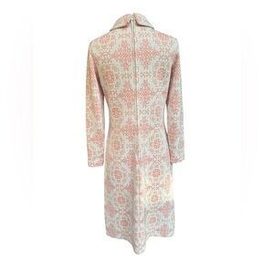 1960s Kimberly Peach Virgin Wool/Poly Blend Peach Geometric Pattern on Off White Shift Dress in excellent used condition. Measurements: bust 35.5”/waist 32”/arm length 23”/hips 36”/length 43.5”