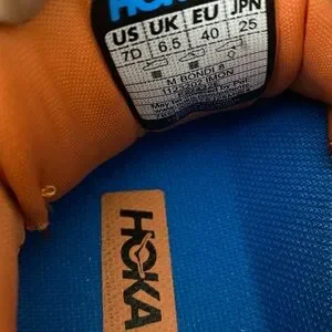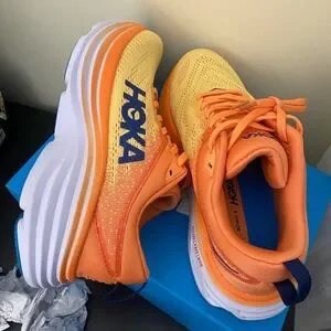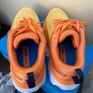 Orange Hoka shoes with blue accents. Comfortable and stylish for running.