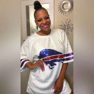 Sale‼️Buffalo Bills sequin dress. White Sequin T-Shirt with Blue and Red Buffalo