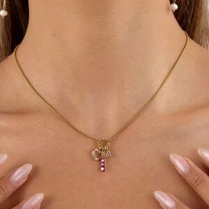 Gold Tone Dainty Twist Ring Pendant Pink Stone Charm Necklace