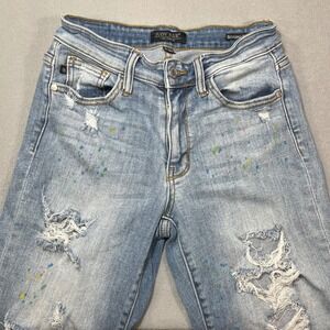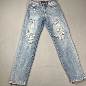 Keywords: Judy Blue Jeans, Boyfriend Fit Jeans, Distressed Jeans, Ripped Jeans, Light Wash Jeans, Paint Splatter Jeans, Women's Jeans, Casual Jeans, Designer Jeans, Fashion Jeans, Denim, Size 3 26 Jeans, Trendy Jeans, Streetwear Jeans, Unique Jeans