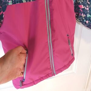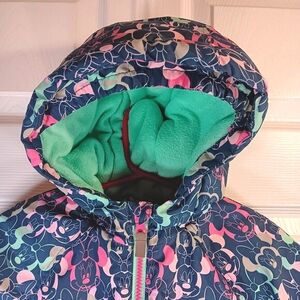 - Color: Dark pink lower body, multi-colored Minnie Mouse graphics on upper chest, arms and hood (navy blue, gray, teal, dark pink, light pink, peach), and teal fleece lining