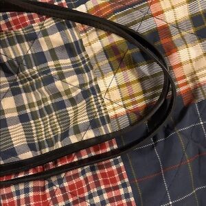 Stylish and versatile tote bag featuring black and cream stripes. Perfect for any occasion. One zippered interior pocket and two slip in interior pockets. Lining is black and not stained or torn. Large bag that measures 21 inches wide at the top and 12 inches tall