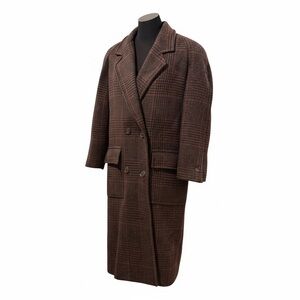 A classic vintage wool overcoat by Harvé Benard by Benard Holtzman, known for refined tailoring and high-quality materials. This timeless long coat features is made with heavy high quality wool with a rich brown plaid pattern. Design is structured silhouette; an elegant cold-weather staple that never goes out of style.
