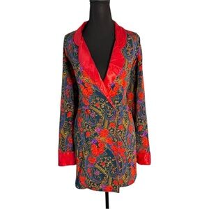Step into timeless elegance with this Vintage 90s Victoria’s Secret Gold Label Robe/Nightgown in a striking floral print. This rare piece features a vibrant red rose pattern, rich jewel-toned swirls, and luxurious red satin lapels and cuffs, all crafted with the signature glamor of Victoria’s Secret’s vintage era.