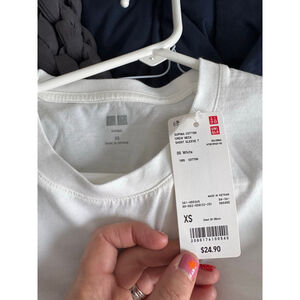 This is a new Uniqlo men's white Supima Cotton crew neck short sleeve t-shirt, size XS, still with its original tags. The shirt is made of 100% cotton and features a classic crew neckline and short sleeves. The care tag indicates machine wash cold. The hang tag shows a price of $24.90 and confirms the size as XS, fitting a chest of 32-35 inches. The shirt appears to be in pristine condition with no visible imperfections.