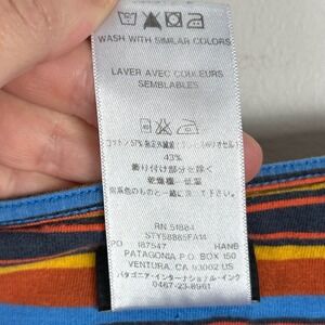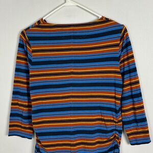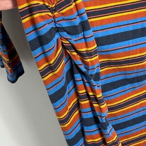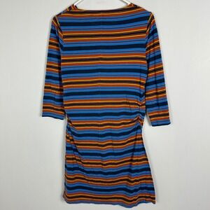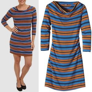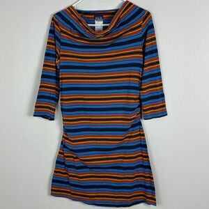 Patagonia Kamala Cowl Neck Dress in Women's Size Medium. Style # 58885. 57% organic cotton and 43% tencel lyocell. Made in Vietnam. 3/4 length sleeves. Ruched details. Retro brown and blue stripes. Colour is called hatty Stripe: Andes Blue. Made in Vietnam. Great pre-owned condition. Please review all photos.