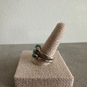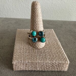 Elegant ring featuring vibrant turquoise and blue topaz stones sat in modern sterling silver design. Signed DTR 925