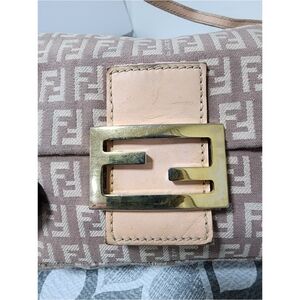 This authentic Fendi Vintage Zucchino Canvas Mini Baguette Bag Beige/Pink is in its pre-owned condition. The exterior canvas material is clean, it shows some sign of rubbing to the material. The pink leather buckle holder shows some sign of scratches and rubbing to it. The interior is clean. The handle is good but shows some sign of glazing to the edges of the shoulder strap. Gold hardware shows some sign of rubbing. Kindly look at pictures above for all details.