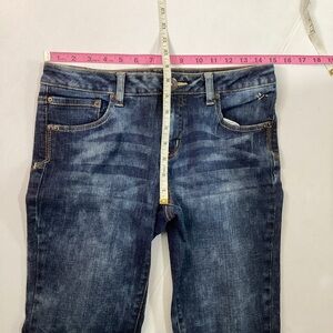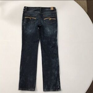 Justice Jeans Simply Low Mildly distressed straight leg Jeans. Size 12 1/2. The color is blue-medium wash. Factory fading in places. Five pockets. Front zipper fly closure. Material is stretchy. Very good preowned condition.