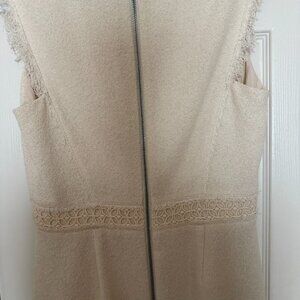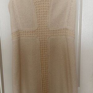 The dress features a solid beige color with embellishments, a V-neckline, and a sleeveless design. Made of tweed fabric, it offers a flattering fit and flare style with a shift silhouette. The dress has a zip closure and is perfect for women looking for a designer piece that exudes sophistication and chicness. Retails at $495